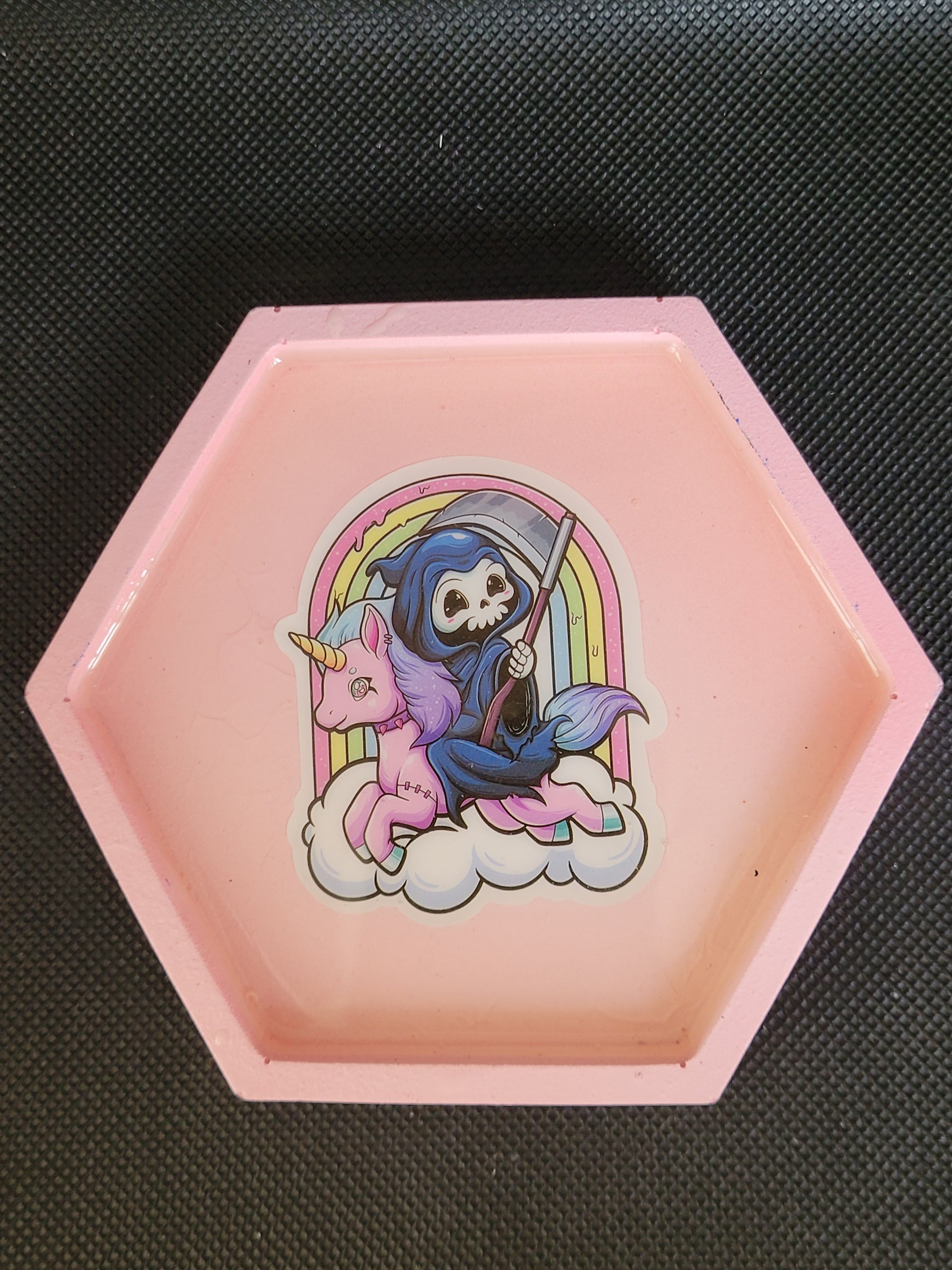 Reaper Riding a Unicorn hexagon resin coaster